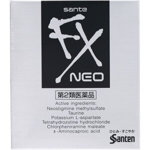 ※写真はイメージです。実際にお届けする商品とパッケージなどが異なる場合がございます。商品の特徴目の疲れは、目に負担がかかり過ぎることに起因します。サンテFXネオは、疲れた目の組織代謝を促進し、目の疲れ・充血などに効果を発揮します。さらに、強い清涼感のあるさし心地で目の表面から爽快感が広がります。目をリフレッシュさせたい!!そんなニーズに応える目薬です。ツイストキャップの開封方法必ずキャップを上にしてあけてください。注:容器の中心を押さえたまま開封すると薬液がとびだすことがあります。●あけ方親指全体でキャップを持ち、親指全体でひねります。●しめ方とまるまでしっかりと押し下げます。【自然環境に配慮し、携帯袋は添付しておりません。ご理解の程お願い申し上げます。】成分・分量ネオスチグミンメチル硫酸塩・・・0.005%(ピント調節機能改善作用により、目の疲れなどを改善します。)タウリン・・・1.0%(目の組織代謝を活発にします。)L−アスパラギン酸カリウム・・・1.0%(目の組織呼吸を高めます。)塩酸テトラヒドロゾリン・・・0.05%(結膜(白目の部分)の充血を抑えます。)クロルフェニラミンマレイン酸塩・・・0.03%(ヒスタミンの働きを抑え、目の炎症・目のかゆみを抑えます。)イプシロン−アミノカプロン酸・・・1.0%(炎症の原因となる物質の産生を抑えます。)添加物として、クロロブタノール、ベンザルコニウム塩化物、ホウ酸、d−ボルネオール、dL−カンフル、L−メントール、pH調節剤を含有します。効能又は効果目の疲れ、結膜充血、目のかゆみ、眼病予防(水泳のあと、ほこりや汗が目に入ったときなど)、紫外線その他の光線による眼炎(雪目など)、目のかすみ(目やにの多いときなど)、眼瞼炎(まぶたのただれ)、ハードコンタクトレンズを装着しているときの不快感用法及び用量【用法・用量】1回2〜3滴、1日5〜6回点眼してください。【用法・用量に関する注意】●次の注意事項をお守りください。(1)過度に使用すると、異常なまぶしさを感じたり、かえって充血を招くことがあります。(2)小児に使用させる場合には、保護者の指導監督のもとに使用させてください。(3)容器の先を、目やまぶた、まつ毛に触れさせないでください(目やにや雑菌などの混入のため、薬液が汚染または混濁することがあります)。また、混濁したものは使用しないでください。(4)ソフトコンタクトレンズを装着したまま使用しないでください。(5)点眼用にのみ使用してください。使用上の注意点-使用上の相談点1.次の人は使用前に医師、薬剤師または登録販売者にご相談ください。(1)医師の治療を受けている人(2)薬などによりアレルギー症状を起こしたことがある人(3)次の症状のある人はげしい目の痛み(4)次の診断を受けた人緑内障2.使用後、次の症状があらわれた場合は副作用の可能性があるので、直ちに使用を中止し、この文書を持って医師、薬剤師または登録販売者にご相談ください。関係部位…症状皮ふ…発疹・発赤、かゆみ目…充血、かゆみ、はれ、しみて痛い3.次の場合は使用を中止し、この文書を持って医師、薬剤師または登録販売者にご相談ください。(1)目のかすみが改善されない場合(2)5〜6日間使用しても症状がよくならない場合保管及び取扱上の注意点(1)直射日光の当たらない涼しい所に密栓して保管してください。製品の品質を保持するため、自動車の中や暖房器具の近くなど高温となる場所に放置しないでください。また、高温となる場所に放置したものは、容器が変形して薬液が漏れたり薬液の品質が劣化しているおそれがありますので、使用しないでください。(2)小児の手の届かない所に保管してください。(3)他の容器に入れ替えないでください。(誤用の原因になったり品質が変わることがあります。)(4)他の人と共用しないでください。(5)使用期限をすぎた製品は使用しないでください。また、使用期限内であっても、開封後はできるだけ速やかに使用してください。(6)保存の状態によっては、成分の結晶が容器の点眼口周囲やキャップの内側に白くつくことがあります。その場合には清潔なガーゼで軽くふき取って使用してください。製造国日本お問合せ先(製造販売元)参天製薬株式会社 「お客様相談室」大阪市北区大深町4-200120-127-023 商品区分【第2類医薬品】広告文責・販売業者文責:薬剤師 篠塚 初男販売業者:株式会社マツモトキヨシ/お問い合わせ先:0120-845-533