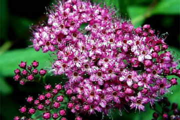 バラ科の落葉小低木で、夏になると、茎頂に淡紅色の小花を密生。主に観賞用に植栽されている。名前の由来は、蕾(つぼみ)に霜のような白い粉があるため「霜付け」からきたという説と、下野国(しもつけのくに→栃木県)で初めて発見された